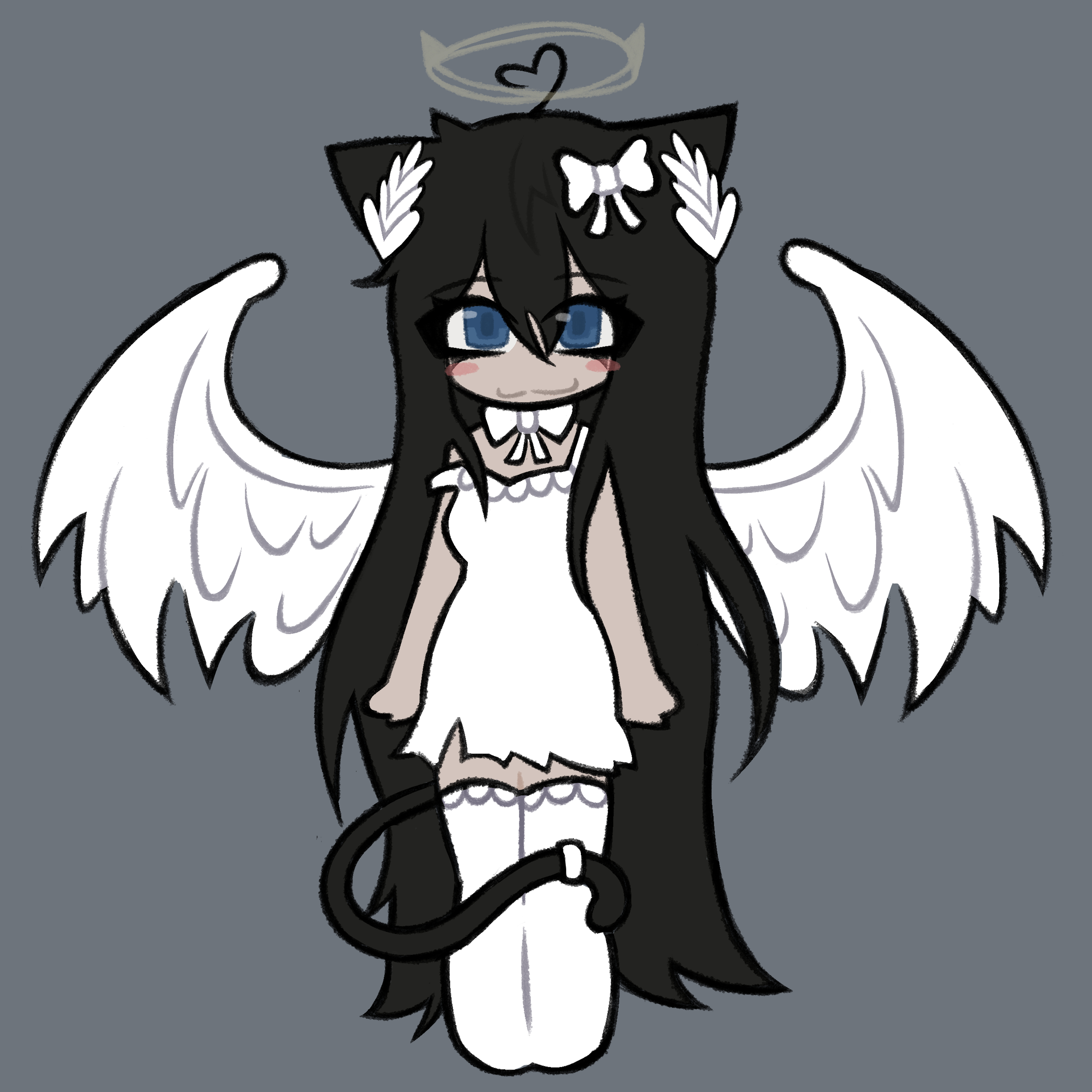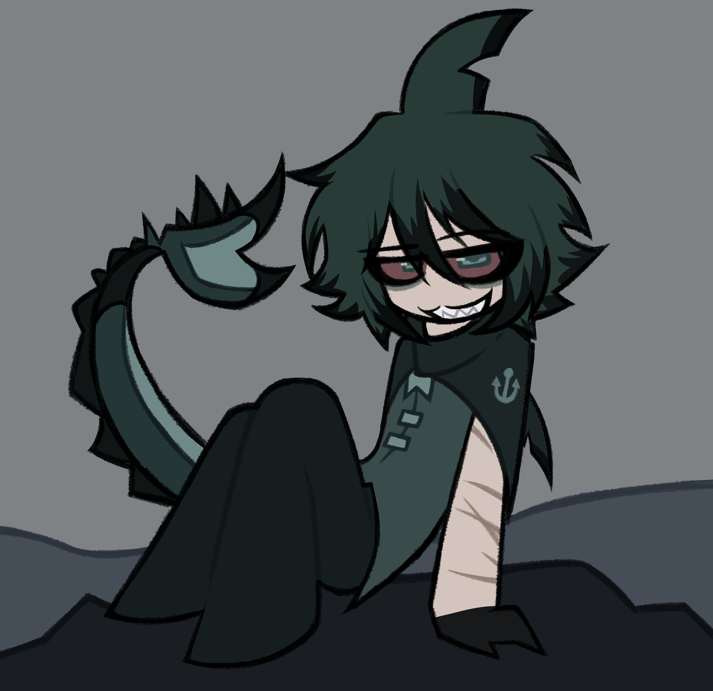 Cabello corto negro con mechas blancas, uniforme de su antiguo colegio, mayormente usa vendas por sus constantes lastimaduras.